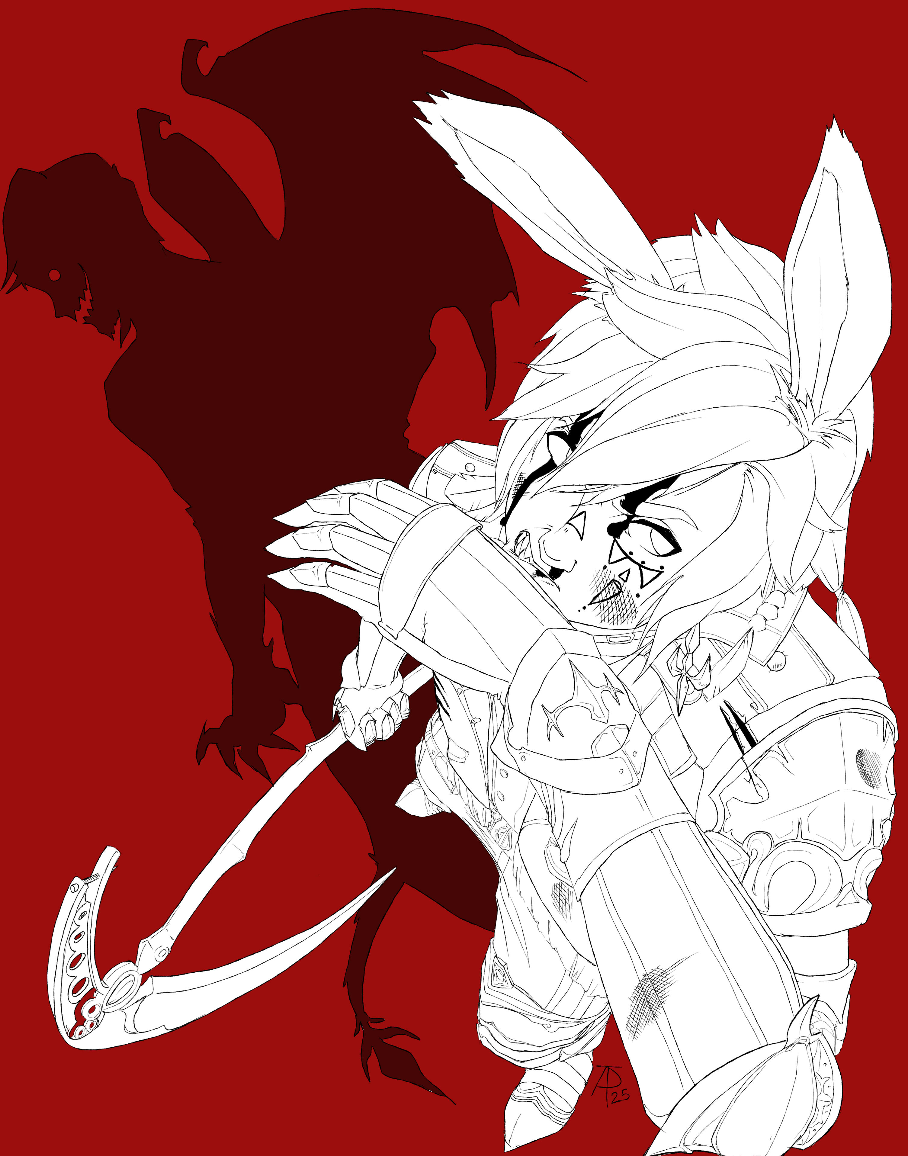 While Mali's spirit was broken bit by bit as events piled up, the darkness within him grew. Literally. The dark side he already had a tenuous partnership with feasted eagerly on Mali's darkest fears and impulses, growing stronger as Mali's will to fight back grew weaker. And when the one eclipsed the other, his dark side saw the chance to strike. It rended Mali's soul to shreds and took hold of his physical body, twisted and contorted into a form not unlike a voidsent. Now unshackled from its undeserving master it could finally enact its revenge upon a world that had stepped on the weak and kind-hearted for far too long.The last and dying shard of Mali's consciousness had only one desire before it parted; to protect what he had held dear in life. To stop the horrid thing it had unleashed by its own weakness. Somehow, some way...Using what little strength he had left, Mali reached out to his darkness and took revenge, rending apart the thing that had destroyed him. He took enough aether back to stay conscious a while longer, while removing his dark side's ability to retain a physical shape. The two were now locked in an unsustainable struggle, both slowly degenerating as they fought, perfectly matched in waning strength. They fought on a battlefield of aether currents across Eorzea, following fluctuations that attracted monsters and adventurers alike. The battles on both sides were intense.When it seemed that both were on the verge of dissipating entirely Mali had a sudden insight upon seeing a fellow adventurer fall. He was intimately aware of how Ascians affected the physical world while having long lost their bodies. If those with the blessing of Zodiark could do it, why not those with the blessing of his primal twin? There was little to lose, and at least one small advantage to gain...And so it was that Mali found a physical form once more. The now unused body of the recently slain Viera took his soul into itself easily. He was whole and hale once more...if in a form wholly unlike him in just about every way possible. But it was enough. His darkness would dissipate, and he would live on.But...for how long? Would his dark side emerge anew? Would it be stronger, fiercer? Would it win out once more? The thought was not lost on his dark side either, and with its own selfish desire to exist it offered to make amends. It would give Mali new gifts befitting its previous ascendance and be beholden to him once more, in return for enough aether to remain, even if in an incorporeal form.Perhaps it was a deal that Mali should not have taken, but the prospect of newfound power--of using the thing he had nearly let run rampant to make amends and become stronger for his comrades--was an appealing proposition. He agreed and sealed the contract by naming his dark side; Lemure, the unexorcisable spirit.